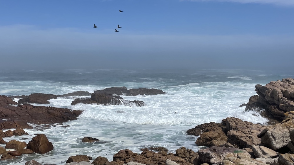 There was a heavy sea mist the following morning so we drove into Lambert's Bay and parked next to the harbour. After a walk to have a look at the boats we had an excellent snack at the cafe. By then the mist had started to lift so we drove a short way to the edge of the town for a walk along the rocky shoreline.