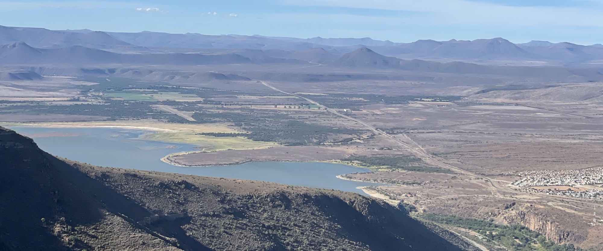 We first stopped at the point which overlooks the town of Graaff-Reinet and the Nqweba dam which looked to be nearly full. The camp is amongst the trees to the north-east of the lake. It was a clear afternoon with hardly any wind so had a lovely view of the surrounding area.