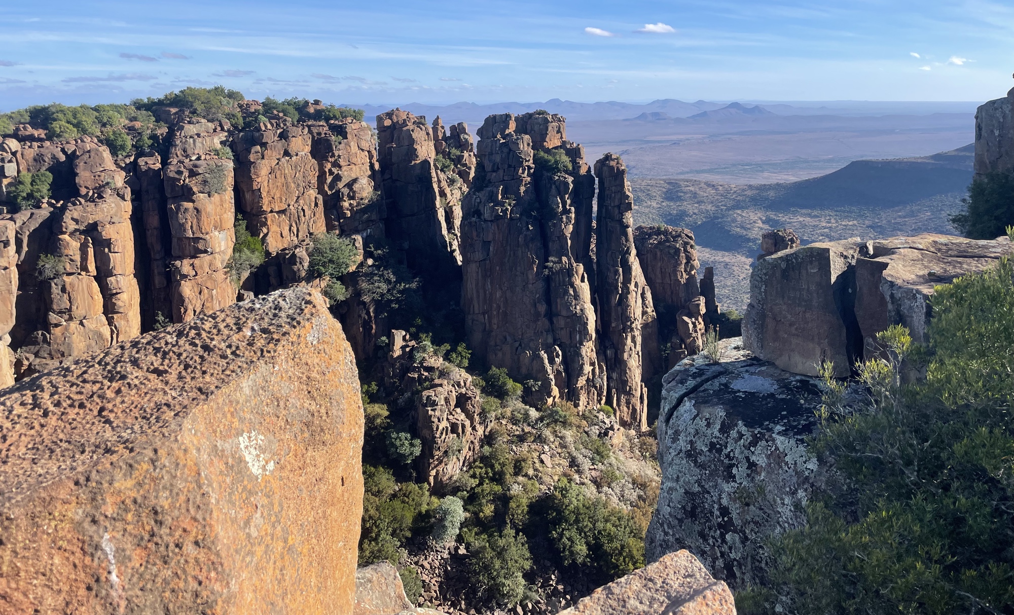 "Sheer cliffs and precariously balanced columns of Dolerite rise 120 metres from the valley floor, against the timeless backdrop of the vast plains of the Camdeboo. This is the product of volcanic and erosive forces of nature over 100 million years".