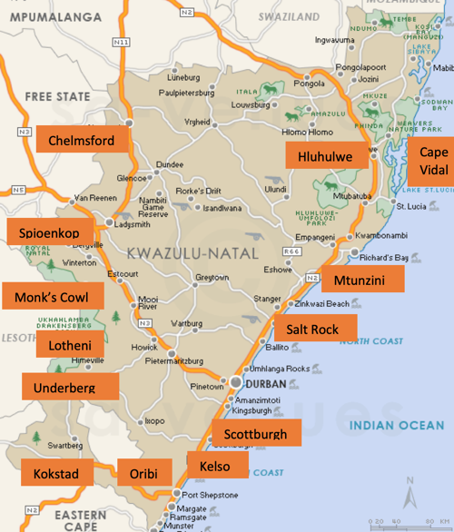 The map shows the campsites that we've used in the KwaZulu-Natal over the past few years.