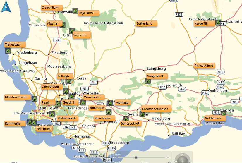 Campsites. South Africa - Western Cape ProvinceWe've spent quite a lot of time in the Western Cape over the past few years. The campsites are listed in alpahbetical order. I've included Sutherland although it's actually in the Northern Cape. Click on the name on the map or scroll down. back to Other South African Provinces