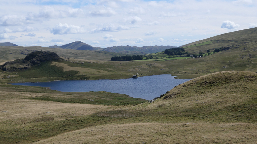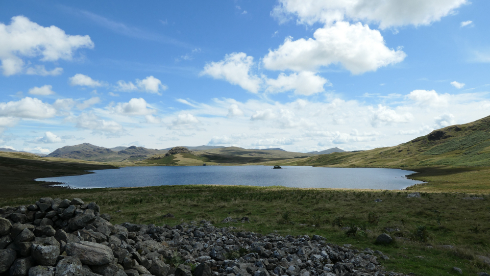 Devoke Water from the far end - the boathouse is just visible in the distance.