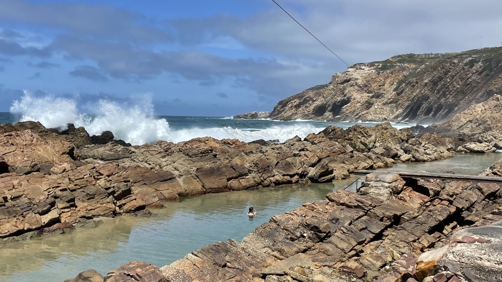 There is a large natural rock pool at The Point. The line at the top of the photo is part of a long zip line from the cliff top to The Point.
