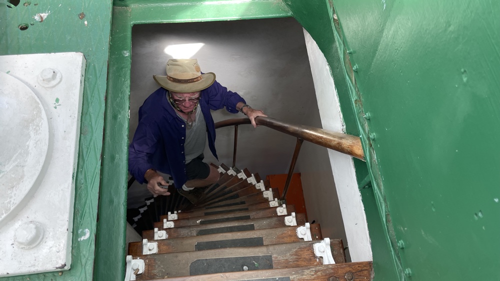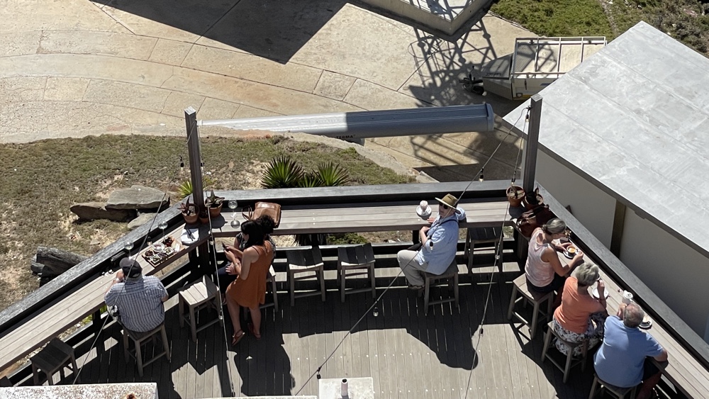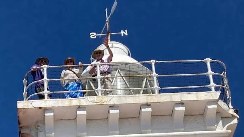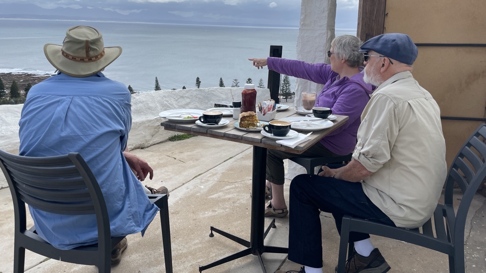 We visited the lighthouse one morning when it wasn't too windy. David, Kevin and I went to the top, managing to negotiate the narrow staircases while Di stayed and had a hot chocolate in the lighthouse cafe down below. We then joined Di and had a coffee while looking out for whales and were lucky enough to spot a couple in the diatance. We also watched a few brave souls tackle the zip line over the sea from the top of the cliffs to the Point.