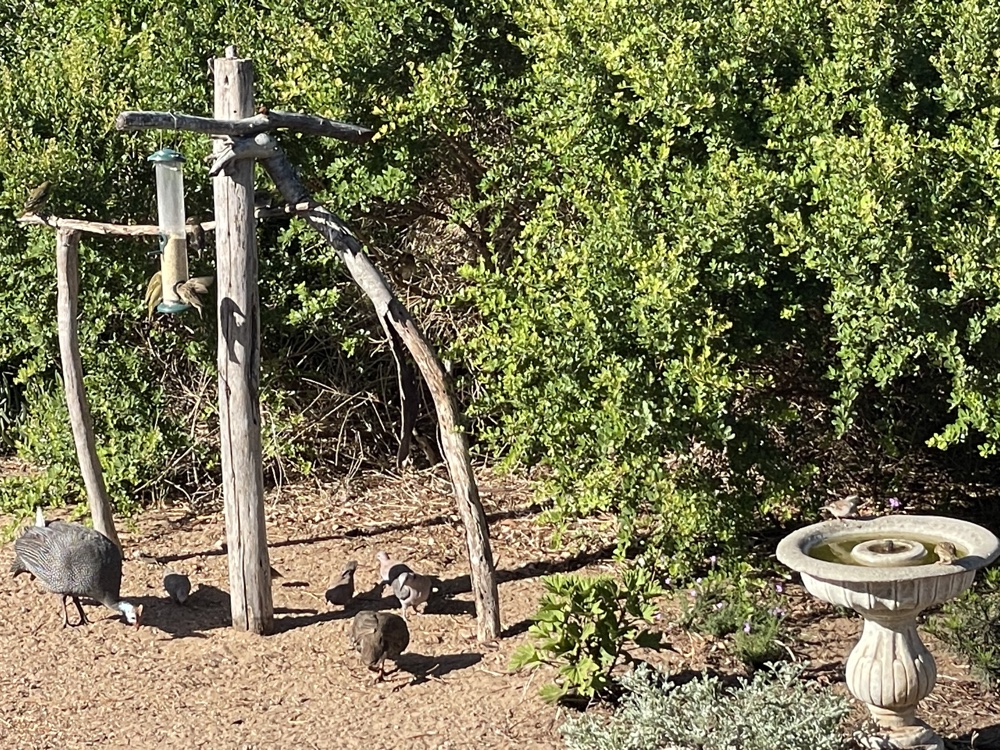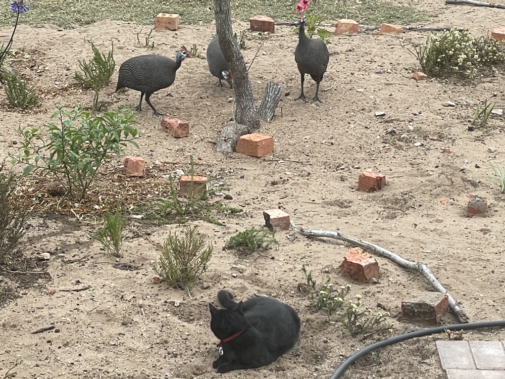 We often spent time watching the birds in the nature reserve at the back of our house where we have put up feeders and bird baths. Our cat and the guinea fowl and spur fowl ignore each other!