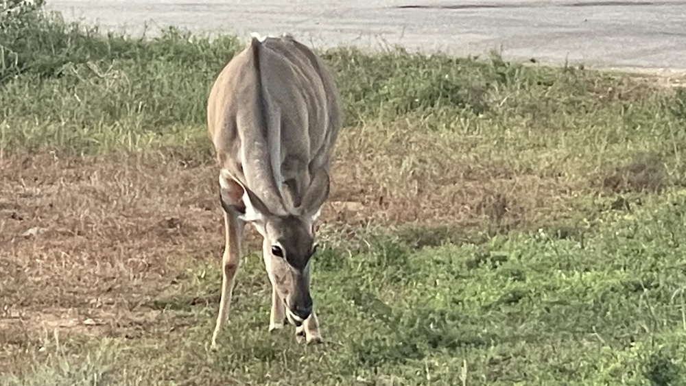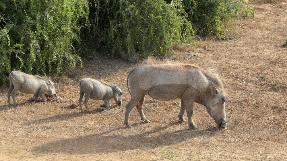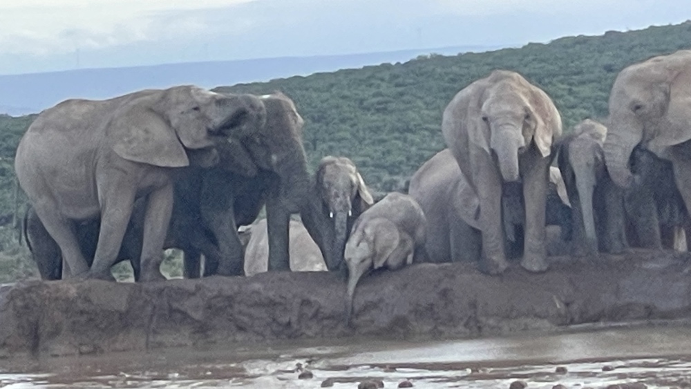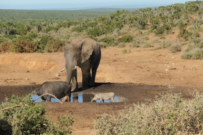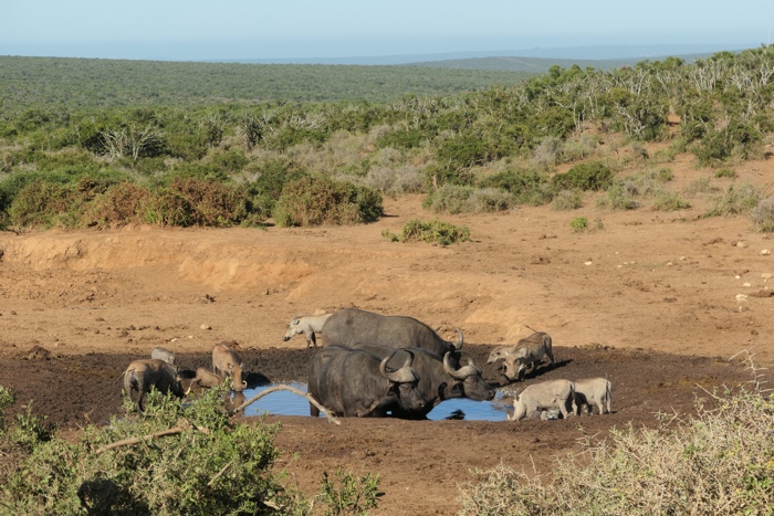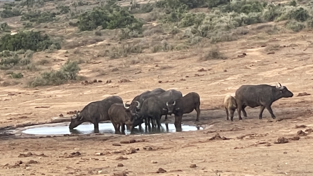 On the morning we left we drove south through the Park, exiting just north of Gqeberha (Port Elizabeth). We stopped at one waterhole where there were several warthogs and 3 buffalo. As we watched we noticed a singe bull elephant in the distance so waited to see what would happen. Most of the warthogs and a couple of the buffalo disappeared but the others stayed and weren't bothered by the elephant.
