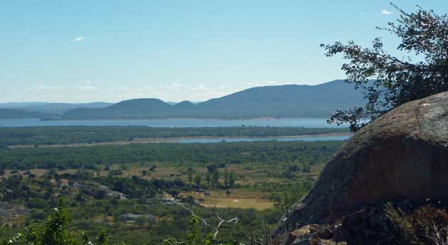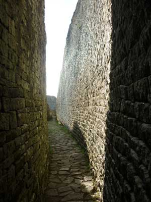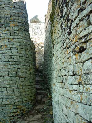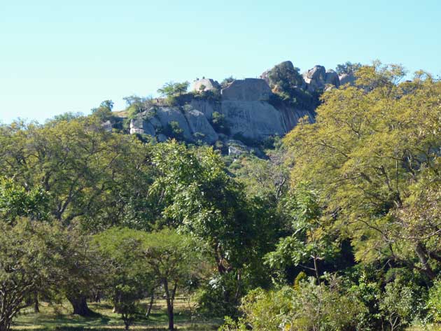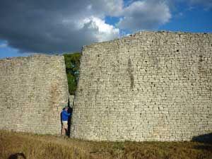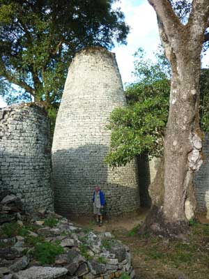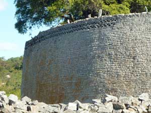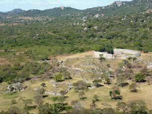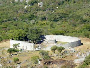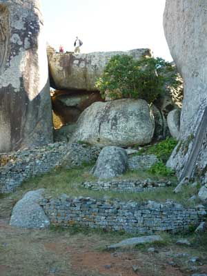 Zimbabwe 2010 - Great Zimbabwe RuinsGreat Zimbabwe (S20 16.143 E30 55.721) is a World Heritage site and was a large town of imposing stone buildings - Zimbabwe means 'houses of stone' - which was built and occupied between the 11th and 15th centuries.. There are over 250 zimbabwes in Southern Africa (mostly in Zimbabwe) but this is by far the largest one. It comprises 3 sections, the Hill Complex, the Valley Complex and the Great Enclosure. It's difficult to show the truly amazing construction of these sites - you really have to go and see them for yourselves. From the campsite we could see the Hill Complex, which was the first part to be built, but until you climb to the top you don't realise how amazing it is. At the top of the centre of the photo is a rock with a couple of 'chimneys' - this is the main entrance to the site.