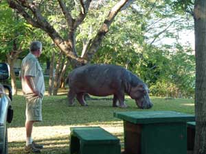 As we arrived we saw this hippo munching on the grass right by our campsite! One evening, just after we’d eaten and were sitting round the campfire we noticed a hippo moving around and then saw a couple more smaller ones. They were eating the grass and gradually getting closer to us so Kev shone a torch at them but to little effect. I got up and stood next to the truck. Then another hippo appeared from behind our chalet and as soon as it saw the other ones it bellowed and charged towards them – they ran off into the lake. There was quite a bit of snorting for some time and a little while later we saw a single hippo feeding on the grass – don’t know if it was the same one. Very glad that we’ve got a rooftop tent as I wouldn’t want a hippo wandering around if we were in a tent on the ground! |