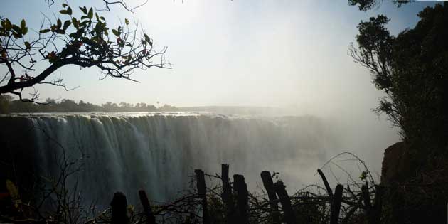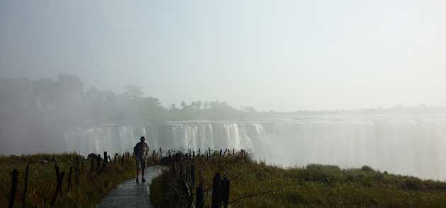 This is as far East as you can get on the Zimbabwian side of the Falls. When we were here 18 months ago we sat on these rocks in the sunshine watching people rafting in the river below! This time we got soaked by the spray. |