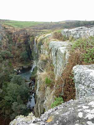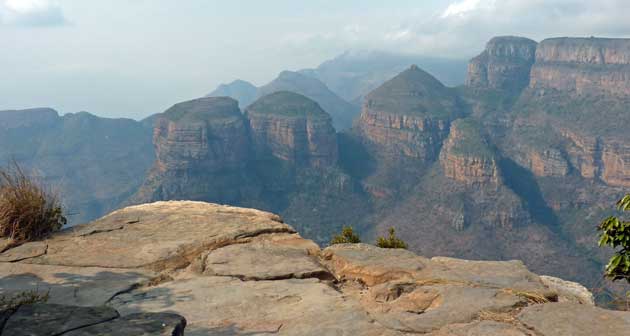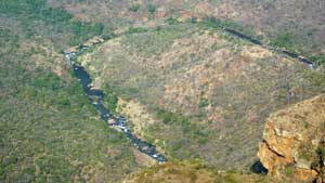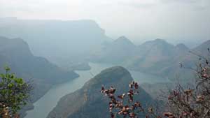 Our final stop was at The Three Rondavals (rondavals are traditional african round houses). The weather had improved slightly so we had a reasonable view. This is the same river valley (The Blyde) that we saw at the potholes but by this time it has carved out a deep canyon. |