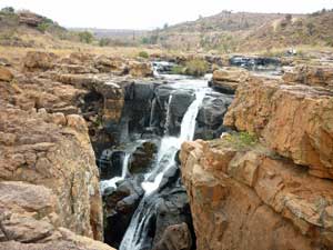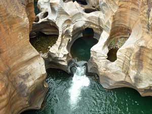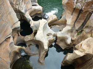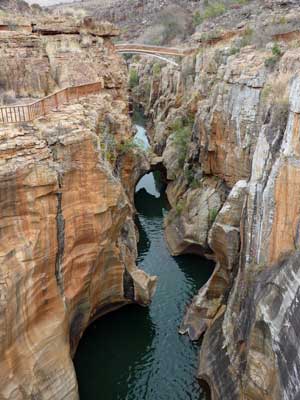 Bourke's Luck Potholes are at the confluence of the Blyde and Treur rivers. The potholes have been carved out by pebbles over over the years. Below is a waterfall on the Treur River and to the right the gorge carved out by the Blyde River. The bridges give access over the gorge and you can then wander over the rocks to get to the Treur RIver.