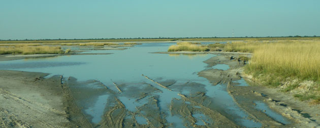 Nata Bird SanctuaryWe then spent a night at Nata Bird Sanctuary in Botswana (S20 17.267 E26 18.012, which is a a community based project. After setting up camp we drove out to the hide overlooking Sua Pan, there was still a lot of water on the tracks - at this one I got out and waded across to test the depth and, more importantly, the firmness of the sand underneath. A couple of months later on our return to South Africa we once again visited the Pan but by this time there was no water on the tracks. The main track through the Bird Sanctuary in March. From the hide we had a great view over the Pan. |