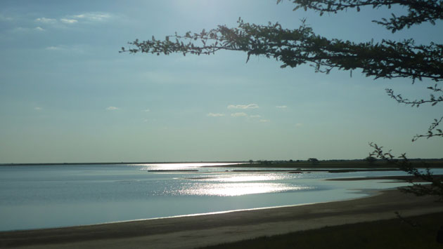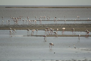 On our second visit to the Pan we saw plenty of flamingoes. The water level was lower than on our first visit but there were still plenty there. In a few months time the Pan will be completely dry. |