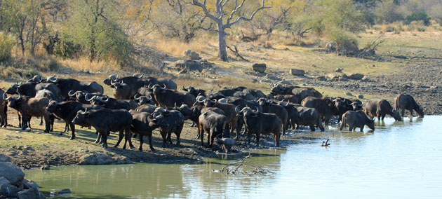 Some of our best animal sightings were at one of the larger waterholes. One afternoon we saw these 4 rhino who had obviously had a great mud bath. After they'd had a drink they walked off and passed by very close to our vehicle - unfortunately I didn't have my camera on the correct setting and the close-up shots were all blurred! The same waterhole but in the morning so the light was better. Just as we were about to leave this large herd of buffalo wandered out of the bush and down to to have a drink. |