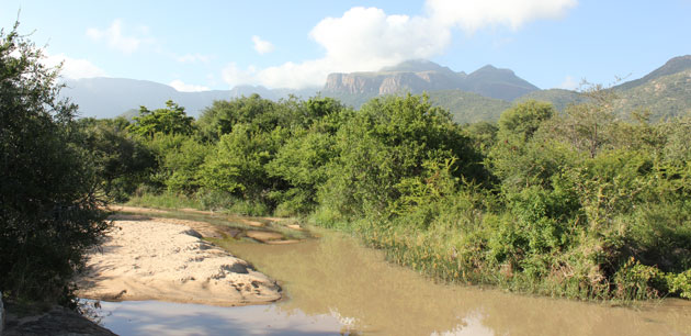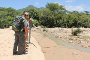 Lowveld, Northern South Africa. January 2012 - Animal Tracks and Signs Course, Moholoholo Mountain View.We spent 6 days at Moholoholo Mountain View taking part in a brilliant Tracking Course. There were just 4 other people on the course: We both had a wonderfult time, Colin was a great teacher and we learnt a lot. 10 days before we arrived they had big floods in the Hoedspruit area so the usually dry river in front of the lodge had water in it. In the background is the Drakensberg escarpment. 90% of the course was out in the field. Colin would find tracks and mark them out with a circle around them. He would then either explain which animal made the track or ask us to work out what left the tracks. |