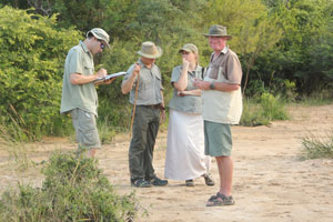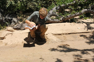 Colin pointing out where a leopard had walked down to the water. Cecile using her book to try and identify a track. |
