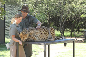 This cheetah was hand reared and cannot be released into the wild so she is used to give people an opportunity to see and stroke a cheetah in the hope that this will help to reduce the number of animals that are poisoned or shot. We all got to stroke the cheetah, a marvelous experience. |