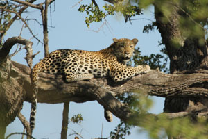 Our best sighting was of a leopard in a tree late one afternoon. After a while it got up, stretched, climbed down the tree and ambled off into the bush. |