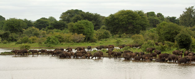 The floods had affected parts of the Park. The bridge to Balule camp had been washed away. A large herd of buffalo at Nsemani Dam. |