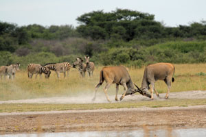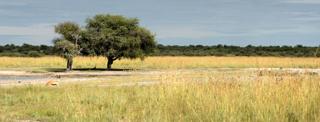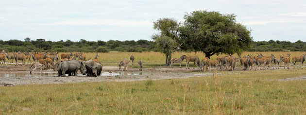 Botswana, February 2012 - Khama Rhino SanctuaryKhama Rhino Sanctuary is a great place to stay between South Africa and Maun. We planned to stay for 2 nights and ended up staying for an extra night. The Reserve was set up to provide a place where rhino could bred and then be relocated to other parts of Botswana. There are also plenty of other animals around. Malema Pan in the early morning - not much about... .... however when we returned later in the morning there were lots of animals - rhino, zebra, eland and springbok. More action at the waterhole on Malema Pan. |
