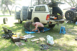 Mike,the Lodge Manager, was very helpful. He phoned a local mechanic and arranged for him to come out the following day. Early next morning Kevin made a start on removing the back wheel to try and check up what was wrong. He wasn’t sure if he would have to remove the brake section before taking out the axle so left that until the mechanic, Chris, arrived and then they worked together on it. They discovered that the bearings were badly damaged and had caused the seal to break. Fortunately Chris was able to get the parts in Shakawe by 4pm the bakkie was ready. |