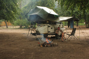 It started to rain just as we set off from the campsite and we only just made it through the very muddy ground near the entrance gate. As we were driving back to the tar road we kept hearing a noise from the back of the vehicle or trailer but, for a while, couldn't locate what was wrong. The third time that we stopped we noticed oil on the rear nearside wheel so Kevin knew that something was up and suspected the wheel bearings as the brakes seemed fine. It was, fortunately, only about 30 kilometres to Shakawe Lodge. It took us nearly 2 hours to get there and for the last few kilometres kevin was driving in 2nd gear! |