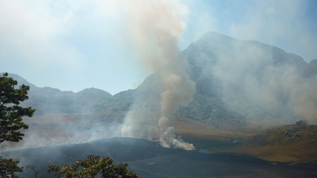 As we approached the hut we could see smoke drifting across the sky and could soon hear the flames. Luckily we were able to get across the fire line quite easily |