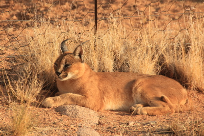 1. Hammerstein Lodge This a popular lodge with tour groups but the campsite is very quiet - it only has 3 sites. The lodge has several enclosures with cats that have been hand-reared and cannot be released into the wild and you can go on a 'wild cat walk' for N$80 per person. The tour groups tend to arrive mid afternoon, do a cat walk late afternoon and then leave early in the morning so the morning cat walk is much quieter - it was just the 2 of us! The first cat they got was a leopard and she's still there but it's considered too dangerous to enter her enclosure. Later the family took on other cats that had been hand-reared and currently they have 2 pairs of caracals and a pair of cheetah. One pair of caracals have an enclosure near the lodge and we often saw one of them walking around. The other enclosures are further away so you only get to see the cats if you do the 'walk'. |