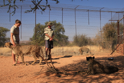 Kevin and our guide with the cheetahs. The leopard is in the next enclosure. |