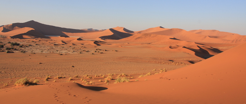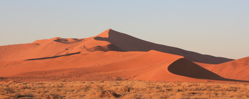 The early morning light creates wonderful shadows on the beautiful red dunes. We walked up one of the smaller dunes at Sossusvlei (which we had to ourselves) and had a great view of the surrounding landscape. |