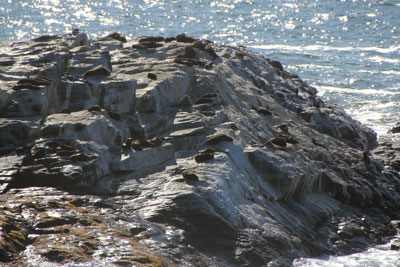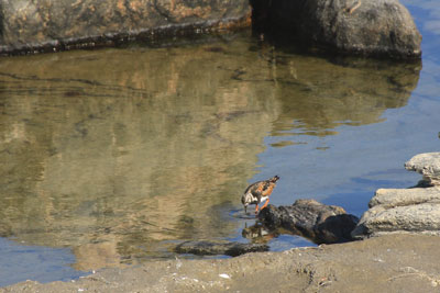 Seals sunning themselves on an offshore island. One of several turnstones in rock-pools under the walkway. |