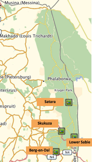 We stopped at 4 Rest Camps in the southern park of the Park - Satara, Lower Sabie, Skukuza and Berg-en-Dal. We all liked the Satara campsite the best as we were able to get a site next to the fence which overlooks an open area of land. We had some amazing sightings in the 7 days that we spent in the park. As we were there before the school holidays started the campsites had plenty of spaces and we didn't have any mass vehicle groupings at animal sightings. The majority of the photos on the Kruger pages were taken by Mark and Jason with my Canon 550D mostly with a 25-200 zoom lens. The ones on the sunset drive and at the Lake Panic bird hide were taken with my 100 - 400 zoom lens. It was the first time that they'd used an SLR camera using the AV mode rather than just on auto and they made big improvements in their technique over the week.