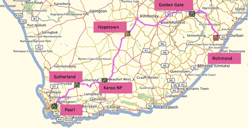 1. Richmond to Cape Peninsula via Golden Gate National Park, Karoo National Park, and the Sutherland Observatory. 2. Cape Peninsula. Kommetjie, Cape Point Nature Reserve, Table Mountain and Kirstenbosch Botanic Gardens. 3. Cape Winelands. Tulbagh, Stellenbosch and Worcester. 4. Cape Peninsula to Richmond via Matjiesfontein, Sutherland, the Karoo, Melton Wold and Gariep Dam.