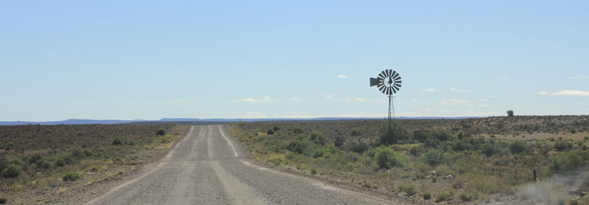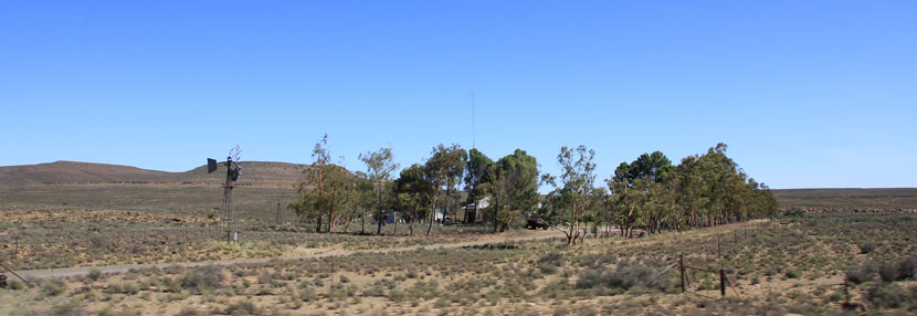 Karoo Back Roads.Between Sutherland and Melton Wold we followed gravel roads. We travelled 250kmwhich took about 5 hours, passing through 2 small town, Fraserburg and Loxton (both looked clean and tidy) and only saw 3 other vehicles on the road. If you see a group of trees while driving through the Karoo there's likely to be farm buildings amongst them. |