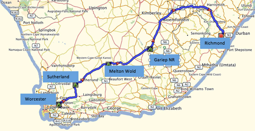 1. Richmond to Cape Peninsula via Golden Gate National Park, Karoo National Park, and the Sutherland Observatory. 2. Cape Peninsula. Kommetjie, Cape Point Nature Reserve, Table Mountain and Kirstenbosch Botanic Gardens. 3. Cape Winelands. Tulbagh, Stellenbosch and Worcester. 4. Cape Peninsula to Richmond via Matjiesfontein, Sutherland, the Karoo, Melton Wold and Gariep Dam.