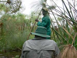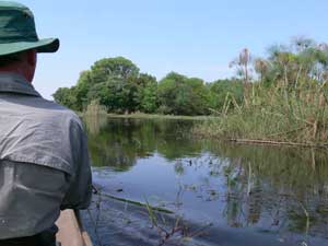One morning we went on a Mokoro trip - a Mokoro is a long narrow flat-bottomed canoe, usually made from a single tree trunk, although the ones at the camp we stayed at were made of fibre-glass in order to save trees. It was a terrific trip, we thoroughly enjoyed it. Once out in the mokoro we discovered that there were lots of channels through which the boats could pass, some were wide open stretches of water whereas other were very narrow. Kevin sat in the front of the canoe, I sat behind him and our guide and poler mostly stood at the back guiding the boat through the channels with a long pole. |