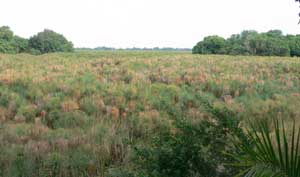 We then drove to the Okavango Panhandle, which is just begriming to be developed so much quieter than the main delta. It's South of the Vetinary Fence so does not have the variety of animals that you can see in the expensive Delta camps to the North and East. We stopped at Nguma Island Lodge (S18 57.223 E22 22.354), on the edge of the Delta, for a couple of nights. This is the view from a deck overlooking the Delta, all you can see is huge papyrus and reeds growing as far as the eye can see with occasional groups of trees. |