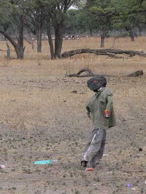 While driving through Botswana we would often see objects at the side of the road to show where tracks to individual houses or small villages were located, as it was often hard to see the tracks. Mostly we would see painted tyres or an old plastic chair hanging in a tree. This was definitely the most imaginative 'sign' that we saw!! Kalahari, Botswana |