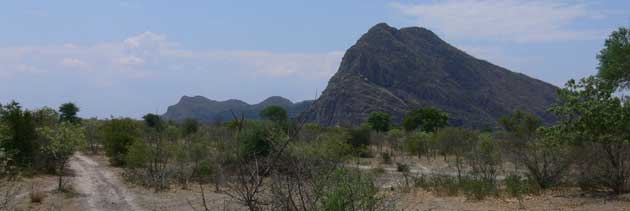 Botswana, Namibia and Victoria Falls. 2008 - Tsodilo Hills, BotswanaWe had the choice of 2 routes to the Tsodilo Hills. The shorter in terms of distance was along a sandy track whereas the other route was on tar and gravel and although 40km longer would be quicker. Kev, of course, chose the sandy track! To start with it was fine with wide verges and firm sand and we were able to travel at 30 – 40km/hour. After 20km or so we came to a small village and after that the track became very narrow and with some sections of deep sand. We’d let the tyres down at the start of the sand but had to let them down again and use low ratio to get through the deep sand. We also had to put the seed net on as there was long grass along the centre of the track. We suspect that this track will eventually disappear as the bush takes over. As we got nearer we could see the Hills - quite a sight after days of flat countryside through the Kalahari and we could understand why they are of great spiritual significance to the bushmen. The nearer hill is called Male Hill and the lower but much larger hill in the distance is Female Hill. |