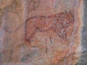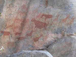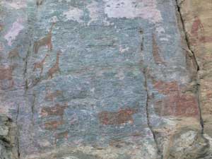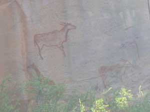 We were very glad that we'd got a guide to take us around the Rhino Trail as we certainly have missed several of the paintings on our own. We were amazed at the quality of the rock art and how well it had kept considering most of it was done 2000 – 3000 years ago. Also surprised at the variety of animals that had been drawn, rhino, elephant, zebra, eland, buffalo, rabbit, scorpion, gemsbok, impala, fish and, most surprising of all, a whale! as well as others of people and geometric designs. It took us nearly 2 hours to do the trail and we saw dozens of paintings. |