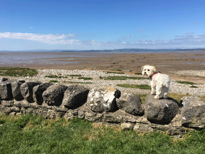 Gracie, Jella's dog, on the sea wall. The tide is out so there are mud flats for miles.