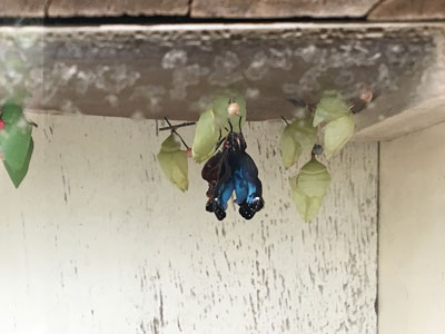 The butterfly emerging from the pupa.