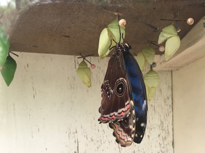 We then visited Butterflies for Africa (also in Pietermaritzburg) which is an enclosed building with colourful butterflies - almost impossible to get a decent photo of the flying and, of course, when they stop they fold their wings up! There was a wall cabinet which had pupae hanging in rows and we were lucky enough to see a butterfly emerging from a pupa. |