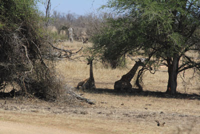 Giraffe are another favourite and we saw them throughout the Park. It's quite unusual for giraffe to lie down. This pair managed to find a shady spot on a very hot day. |