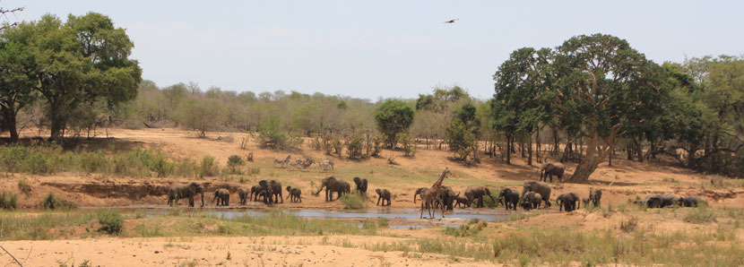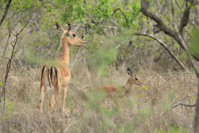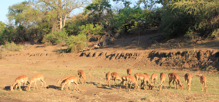 The most common sightings are always buck, in particular impala. November to January is when the young impala are born so we were hoping to see some,however it wasn't until our last couple of days right at the Souther n end of the park that we saw a few. A group of impala enjoying some new grass in a dry river bed. |
