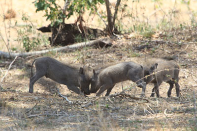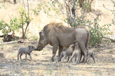 We spent the best part of 2 hours at Transport Dam which, unlike many of the other Dams, had plenty of water. During that time there was a constant stream of animals coming down to drink - zebra, wildebeest, impala, waterbuck and kudu. The zebra were the most skittish, they would come a little way, stop and have a good look round and then come a little further. Something would then spook one of them and they'd all run off for a short distance before repeating the process. Eventually one of them would make it to the water and the others would then follow. We watched this wathog family for ages. The four youngsters spent most of the time playing with each other, after which they needed a drink from mum. |