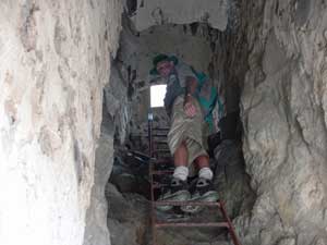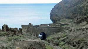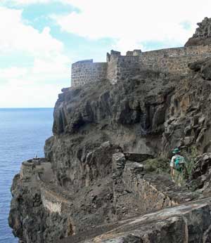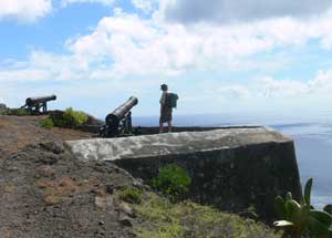 The only fort built inland was High Knoll Fort, built on a hill overlooking Jamestown. This photo was taken from just below Diana's Peak (the highest point on the island). The wall has collapsed in a couple of places so it's not possible to easily get into the fort - but Kevin did!