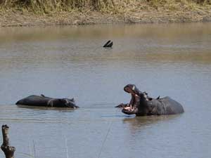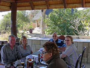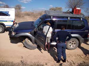 On a gravel road while Diana was driving the front nearside wheel came off the truck...... We were all fine but we were stuck in the middle of nowhere. (It wasn't anything to do with Diana's driving, just one of those things). A few minutes later a gentleman stopped and asked if we needed help, he turned out to be the headmaster of the local secondary school and soon called the police out (to make other traffic aware of our predicament) and tried to explain to our insurance company exactly where we were! Then another guy stopped and, amazingly, turned out to be the owner of the safari lodge that we were going to! |
