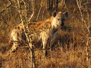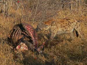 On our last morning we saw vultures high up in nearby trees. Andre and Rufus decided it was worth investigating and we soon came across this hyena near the track. We followed it and could see that it appeared to be eating something so Andre took the truck right into the bush where we had a fantastic view of the hyena eating the remains of a buffalo. |